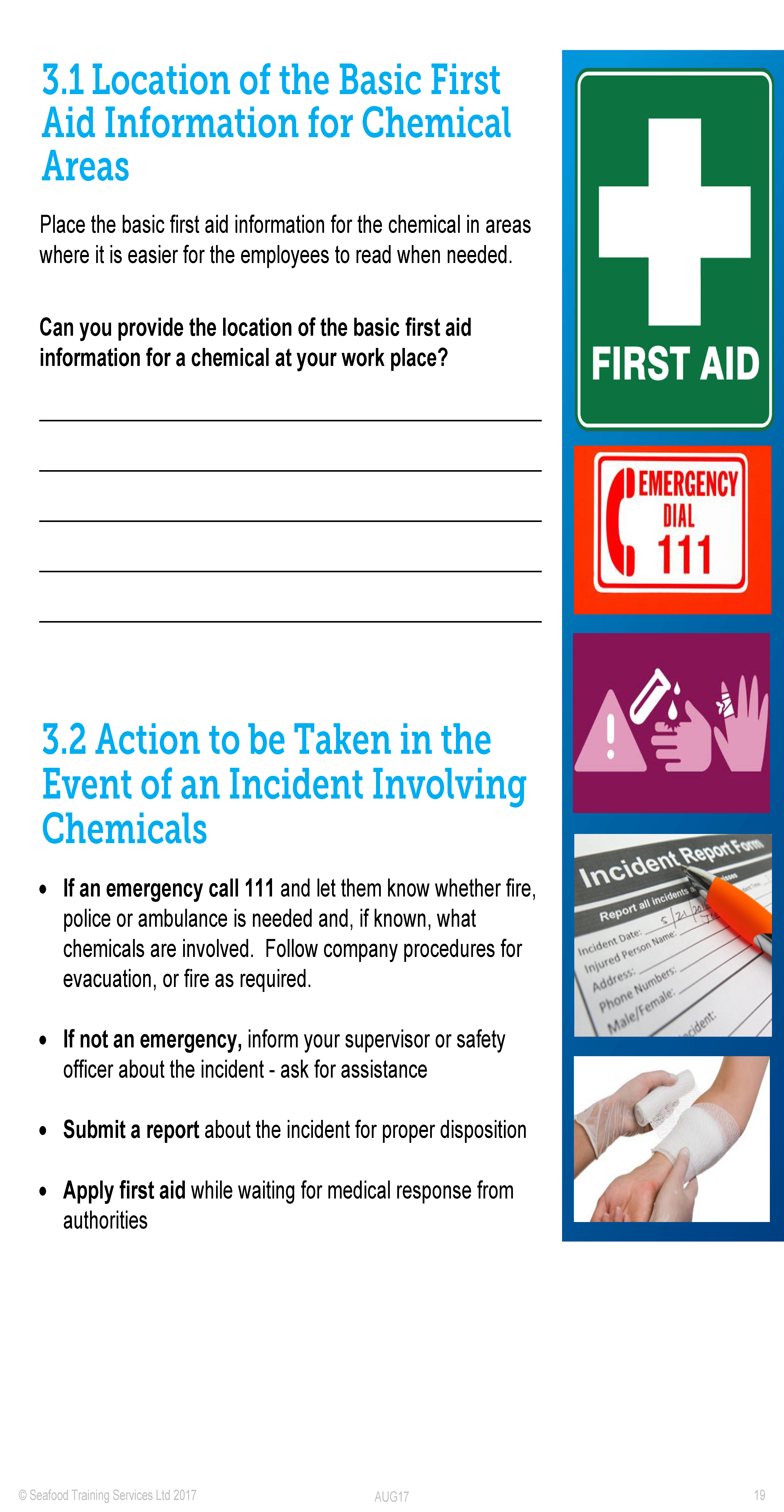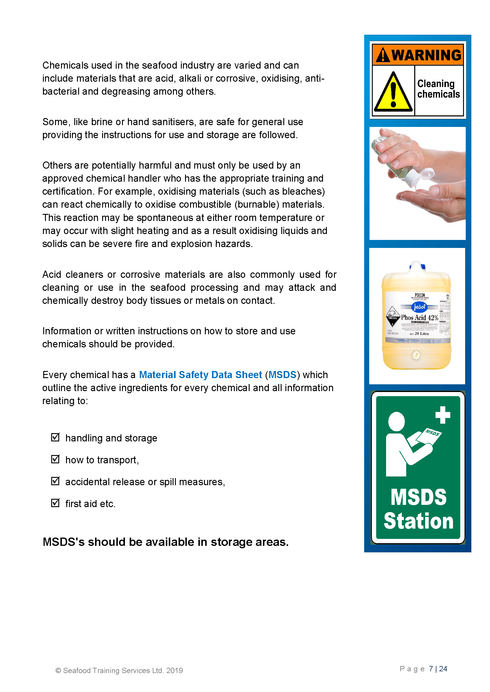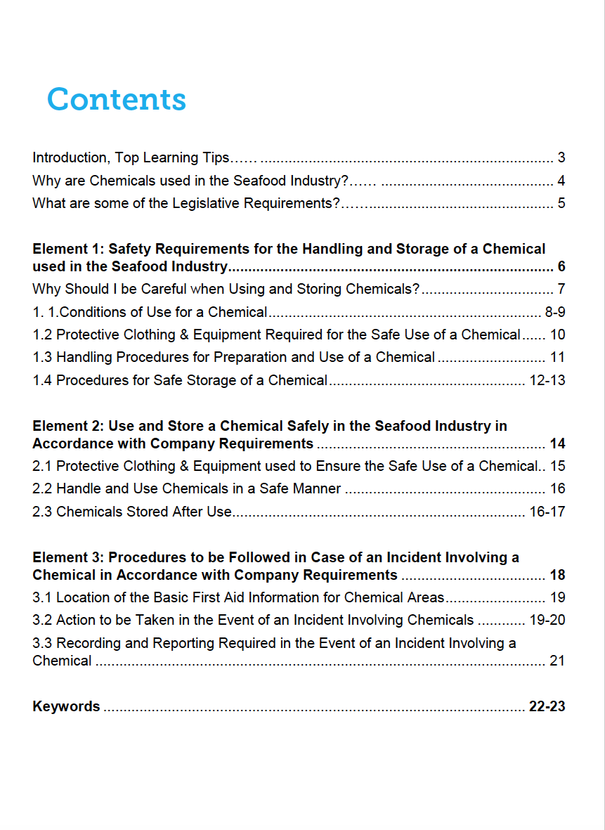 People credited with this unit standard are able to demonstrate knowledge of the safety requirements for the handling and storage of a chemical used in a seafood operation; use and store a chemical safely; and the procedures to be followed in case of an incident involving a chemical, in a seafood operation.