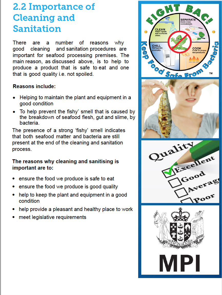 People credited with this unit standard are able to demonstrate knowledge of contamination, a cleaning and sanitisation programme, and clean and sanitise in a seafood operation.