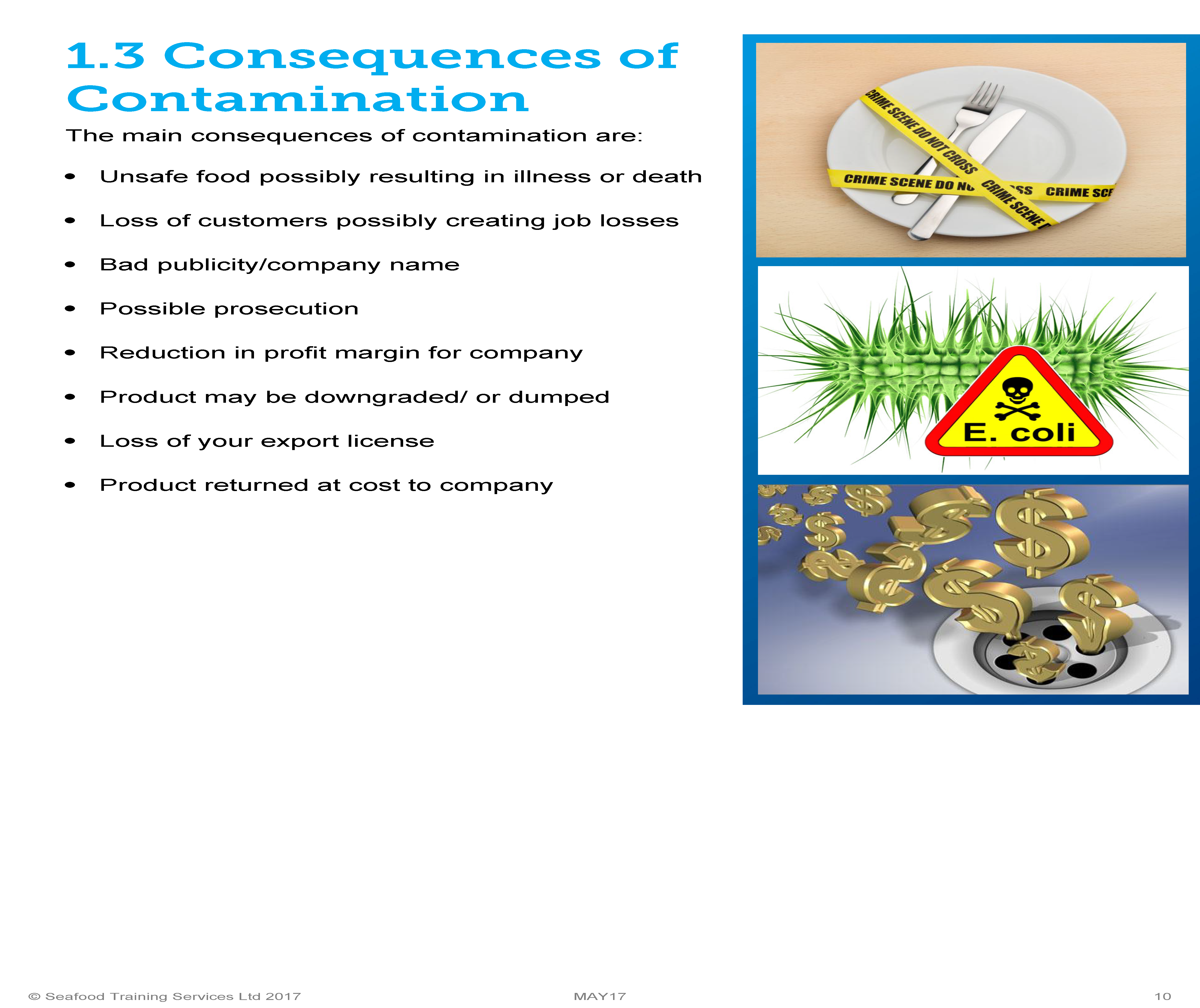 People credited with this unit standard are able to describe microorganisms found, the potential sources of and corrective action for microbial contamination, and activities used for the verification of the cleaning and sanitation process in a seafood operation.