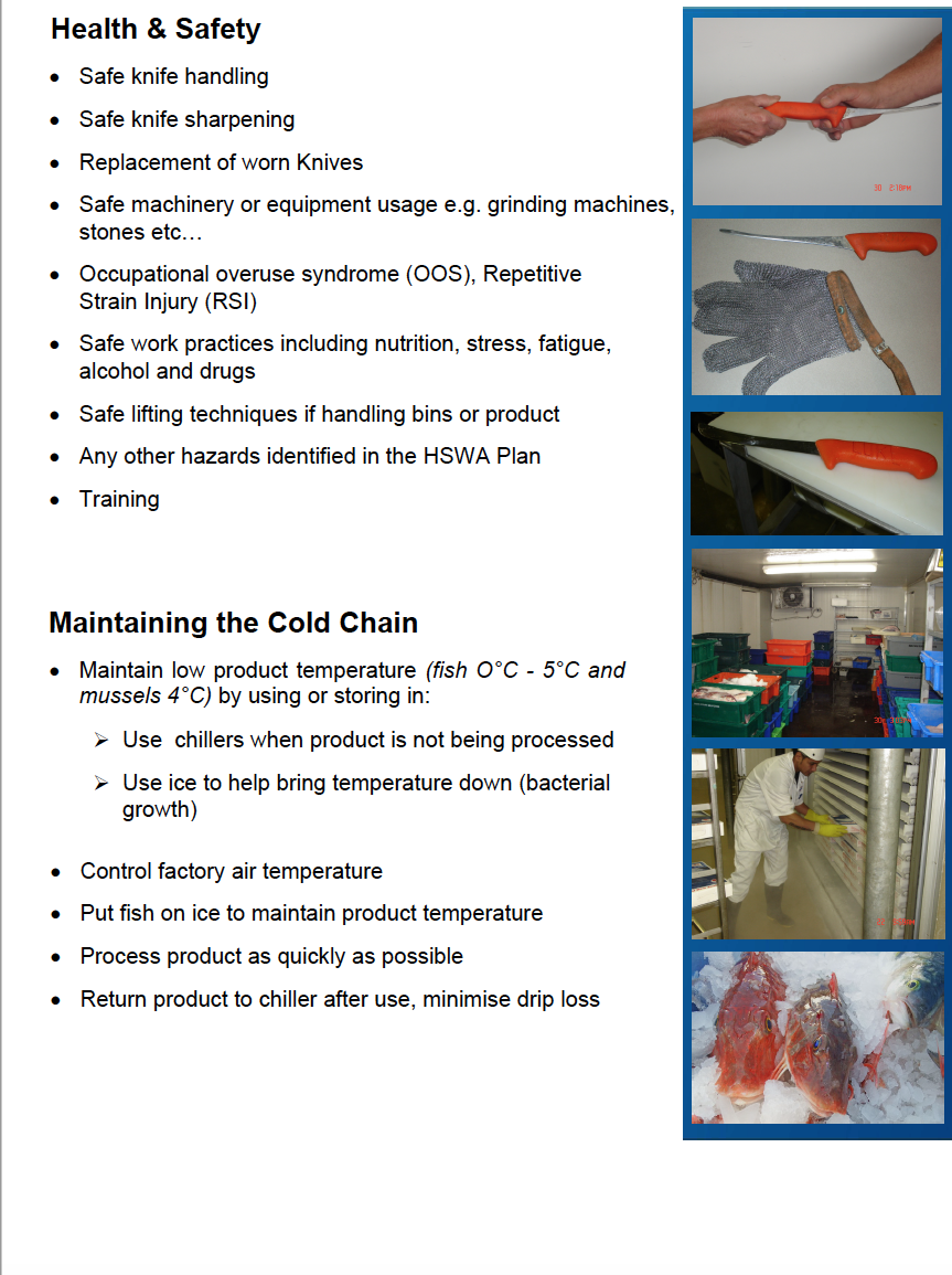 People credited with this unit standard are able to demonstrate knowledge of the maintenance of a safe work area while working with seafood products; and maintain a safe work area while working with seafood products.