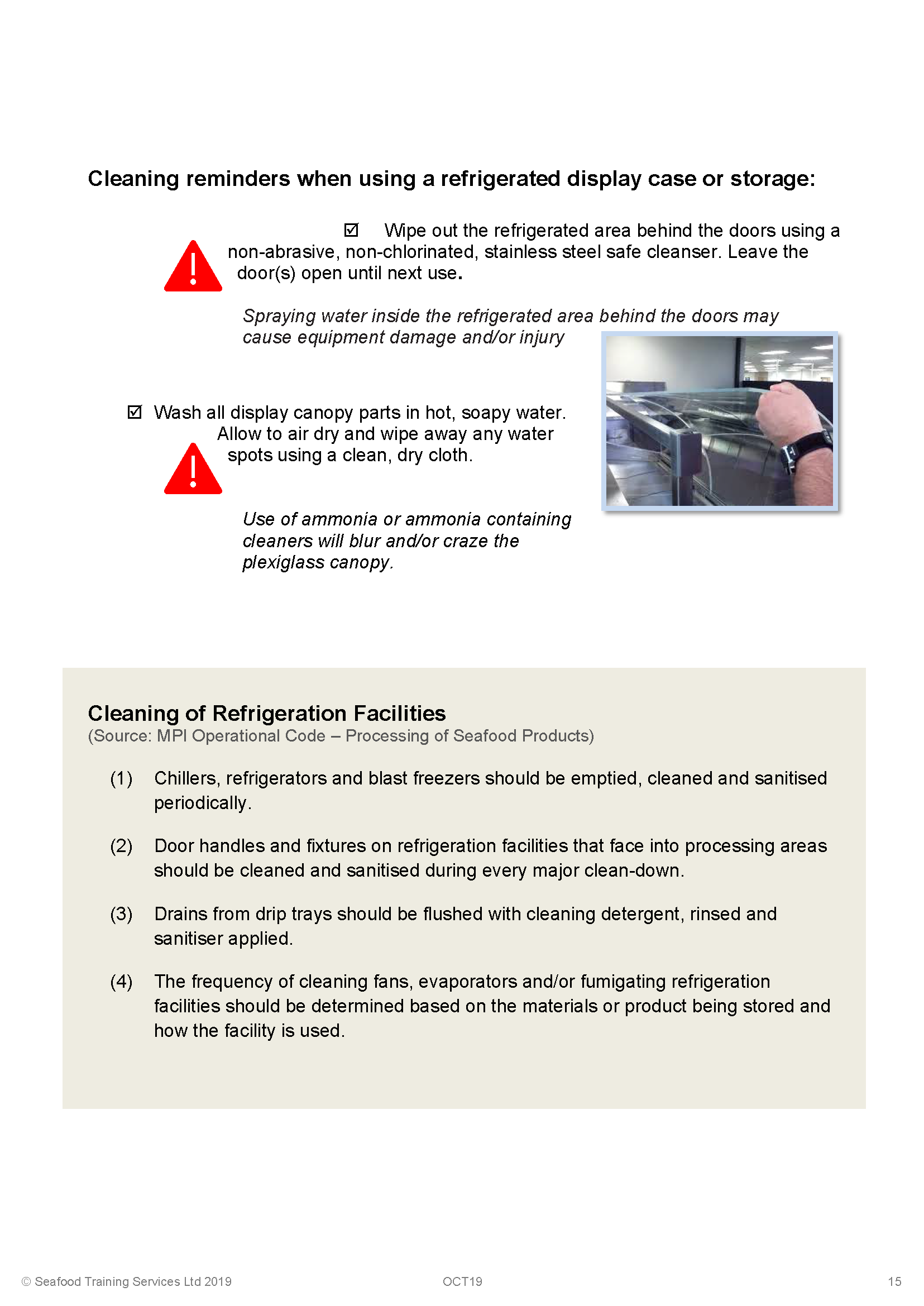 People credited with this unit standard are able to: demonstrate knowledge of the preparation required for cleaning the seafood display and storage area at point-of-sale, prepare the seafood display and storage area for cleaning at point-of-sale, and clean the seafood display and storage area at point-of-sale.