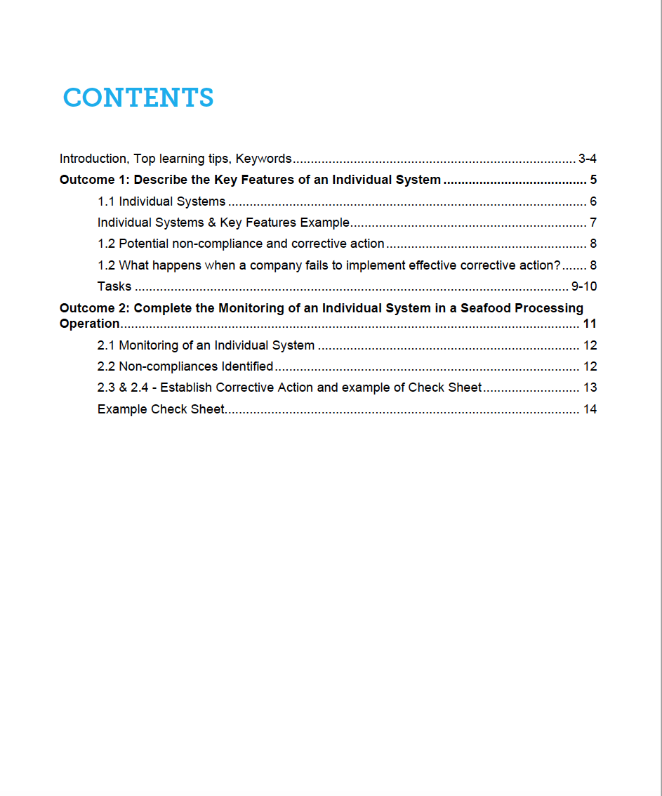 People credited with this unit standard are able to demonstrate knowledge of the key features of and complete the monitoring of an individual system in a seafood operation, identify noncompliance, and take corrective action.