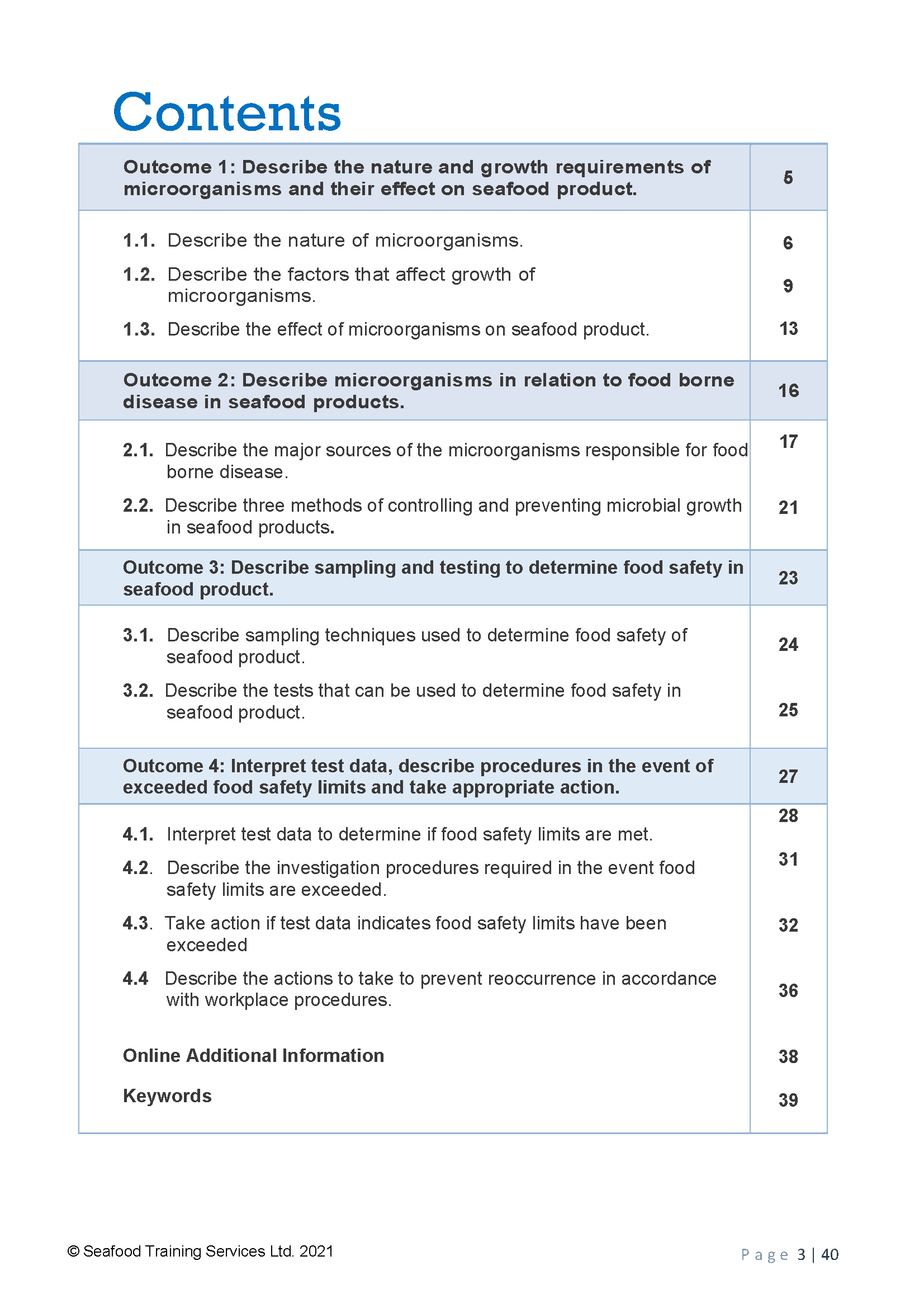 People credited with this unit standard are able to describe the nature and growth requirements of microorganisms and their effect seafood product; microorganisms in relation to food borne disease in seafood products; and sampling and testing to determine food safety in seafood product. They are also able to interpret test data, describe procedures in the event of exceeded food safety limits and take appropriate action.